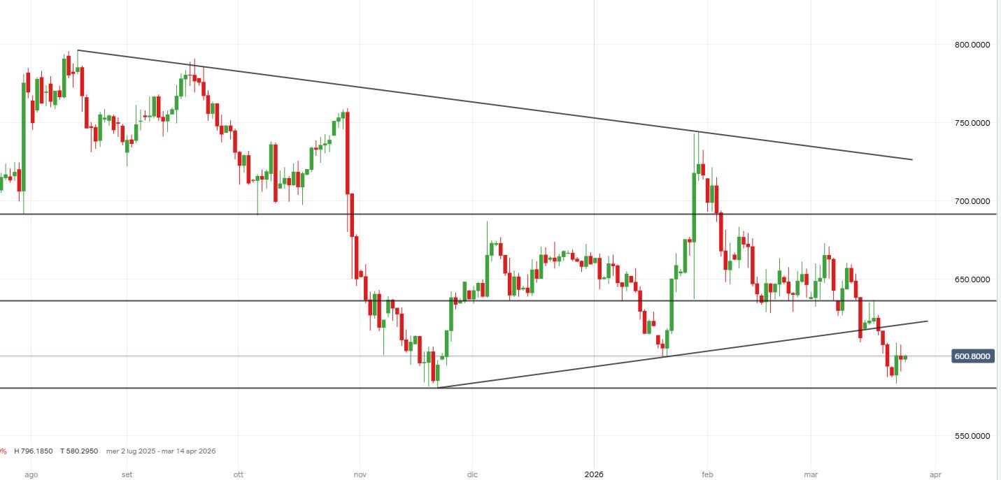 Nelle ultime sedute di contrattazioni, le azioni Meta Platforms sono rimbalzate dopo aver sfiorato il supporto orizzontale in area 580 dollari, rimanendo tuttavia all’interno della tendenza ribassista in atto dai massimi segnati a fine gennaio in area 740 dollari. Guardando l’azione dei corsi in atto da novembre, i prezzi si trovano all’interno della struttura laterale che vede come supporto area 580 dollari e come resistenza area 670 dollari.