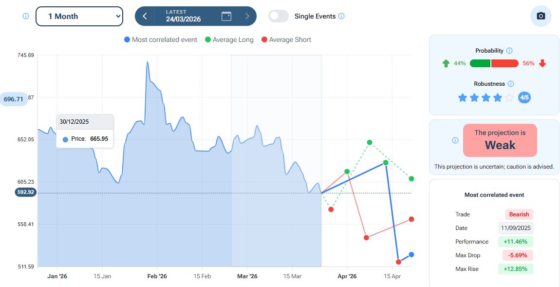 Il tool “Projection” della piattaforma Forecaster, con orizzonte temporale a 1 mese, evidenzia nello scenario “best match” (linea blu) un iniziale movimento rialzista che potrebbe portare i prezzi fino in zona 626 dollari, seguito da un possibile ribasso verso area 516 dollari (PREVEDERE I MERCATI CON L’INTELLIGENZA ARTIFICIALE: la funzionalità di Forecaster Terminal).