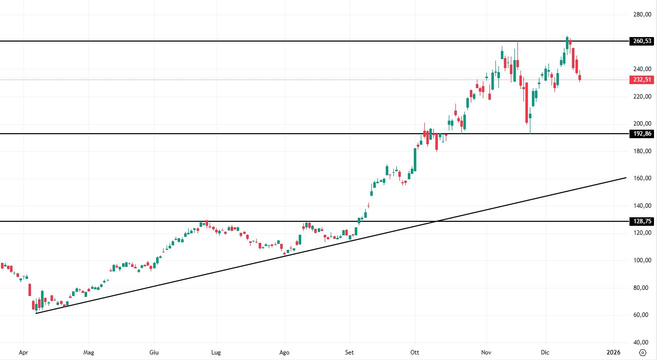 Sotto osservazione anche la strategia sugli investimenti. Micron ha più volte ribadito l’importanza di mantenere una rigorosa disciplina sul capitale per evitare squilibri di offerta in futuro. Il mercato cercherà indicazioni su eventuali aumenti del Capex legati all’espansione della capacità produttiva HBM e sulle tempistiche di tali investimenti, valutando se restino coerenti con la visibilità della domanda AI. Vediamo ora il quadro grafico e la possibile strategia.