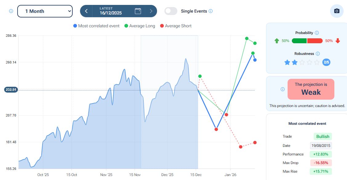 Il tool “Projection” della piattaforma Forecaster, con scadenza a 1 mese, evidenzia – negli scenari “best match” e “long”- un iniziale ribasso compreso tra il 10% e il 17% seguito da un rialzo che potrebbe portare i prezzi in area 269-283 dollari (PREVEDERE I MERCATI CON L’INTELLIGENZA ARTIFICIALE: la nuova funzionalità di Forecaster Terminal).