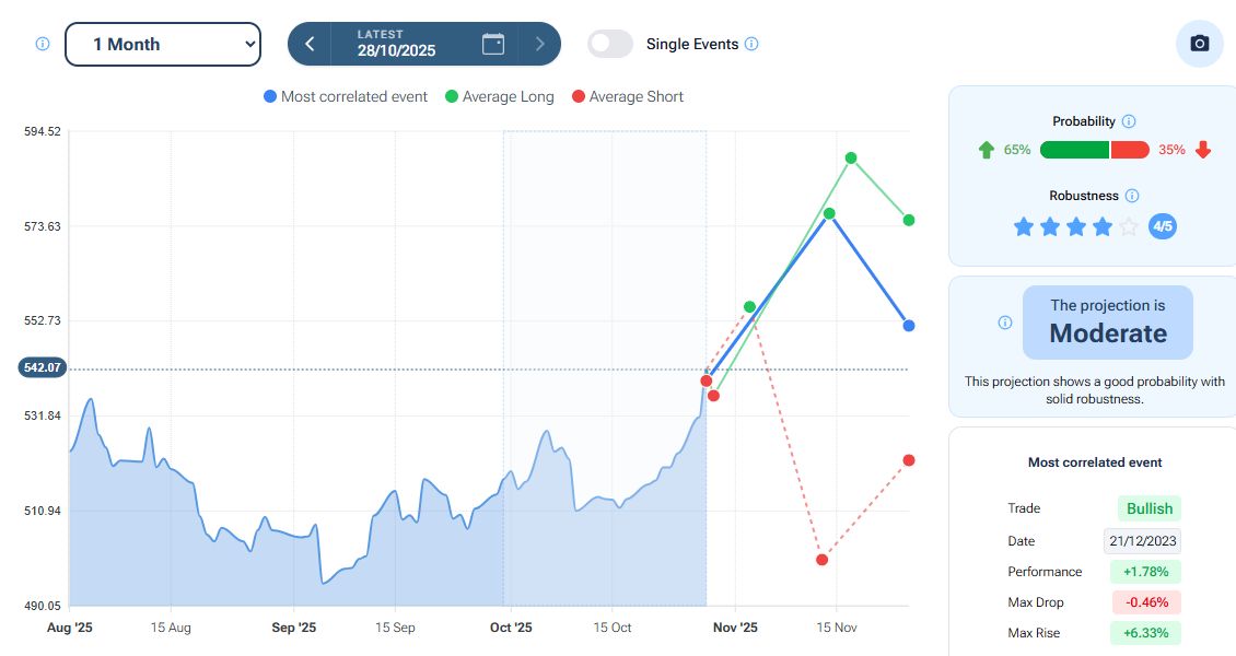 Il tool “Projection” della piattaforma Forecaster, con scadenza a un mese, evidenzia andamenti simili negli scenari “best match” e “long, rispettivamente la linea blu e la linea verde. Per metà novembre, nel primo scenario, si stima un progresso di oltre il 6% in area 576 dollari, nel secondo invece un rialzo di oltre l’8%, in area 588 dollari.