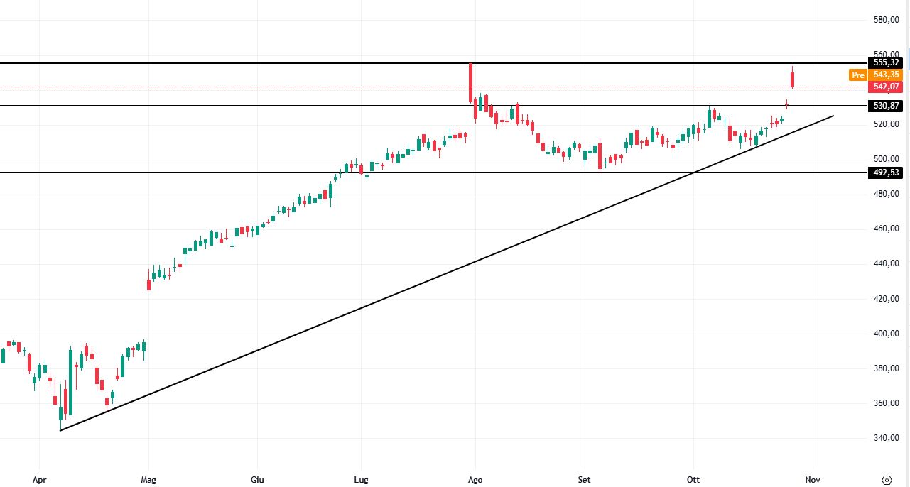 Si potrebbero quindi valutare strategie long con il breakout dei 555 dollari. In tal caso, il primo obiettivo di profitto di breve termine potrebbe essere posto in area 580 dollari, mentre un secondo target potrebbe essere in area 588-590 dollari.