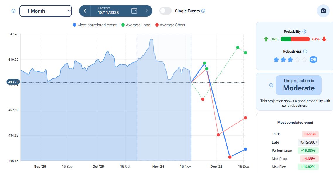 Il tool “Projection” della piattaforma Forecaster, con scadenza a un mese, evidenzia negli scenari “best match” e “short” ribassi compresi tra l’11% e il 17% circa, che porterebbero le quotazioni in area 435-410 dollari, prima di un eventuale rimbalzo. Guarda il video di lancio della funzionalità, PREVEDERE I MERCATI CON L’INTELLIGENZA ARTIFICIALE: la nuova funzionalità di Forecaster Terminal.