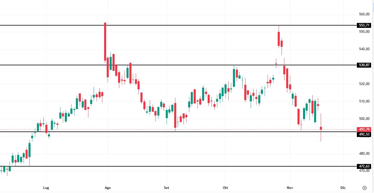 Si potrebbero dunque valutare strategie long dai vicini supporti in area 492 dollari o più in basso in zona 470-472 dollari. Eventuali posizioni in acquisto avrebbero come primo obiettivo area 530 dollari e un secondo target sui massimi in area 553 dollari.