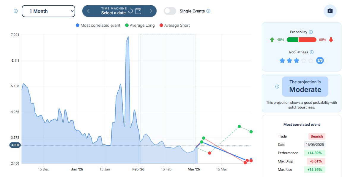 Il tool “Projection” della piattaforma Forecaster, con orizzonte temporale a un mese, evidenzia – nello scenario “best match” (linea blu) e “short” (linea rossa) – un iniziale rialzo fino ad area 3,22-3,36 dollari, seguito da un movimento negativo che potrebbe portare i prezzi in area 2,48-2,56 dollari (PREVEDERE I MERCATI CON L’INTELLIGENZA ARTIFICIALE: la nuova funzionalità di Forecaster Terminal).