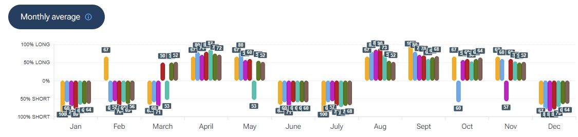 Per quanto riguarda la stagionalità - analizzata con la piattaforma Forecaster - gli archi temporali selezionati mostrano una possibile fase negativa fino a fine marzo, seguita da una ripartenza al rialzo che potrebbe estendersi fino alla fine della seconda decade di giugno.