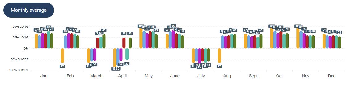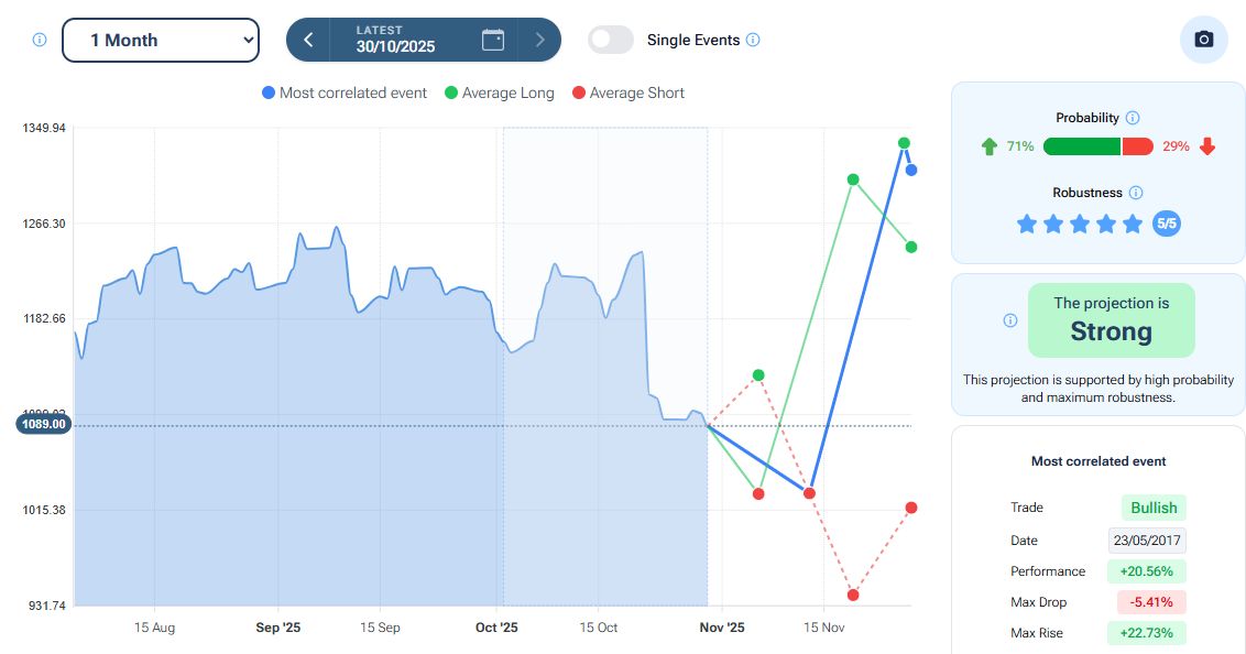 Per quanto riguarda la stagionalità - analizzata con la piattaforma Forecaster - gli archi temporali selezionati mostrano una possibile fase rialzista fino a inizio dicembre, seguita da un possibile storno che potrebbe durare fino a fine mese.