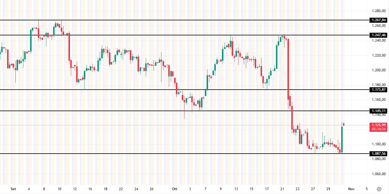 Si potrebbero quindi valutare strategie long in caso di storno e conseguenti segnali di forza in area 1.100-1.090 dollari. In tal caso, posizioni in acquisto potrebbero avere un primo obiettivo di profitto in area 1.145 dollari e un secondo target in area 1.173 dollari.