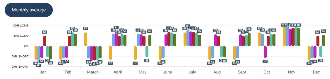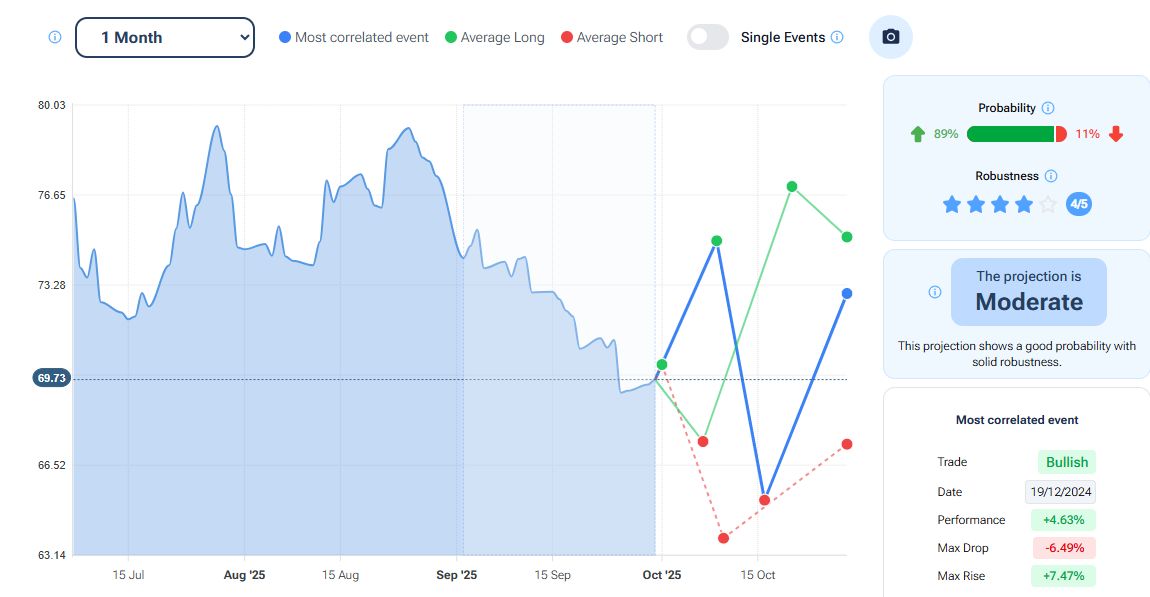 Per quanto riguarda la stagionalità - analizzata con la piattaforma Forecaster - gli archi temporali selezionati mostrano un possibile minimo entro la fine della prima decade di ottobre, seguito da una fase rialzista che potrebbe estendersi fino ai primi giorni di dicembre.