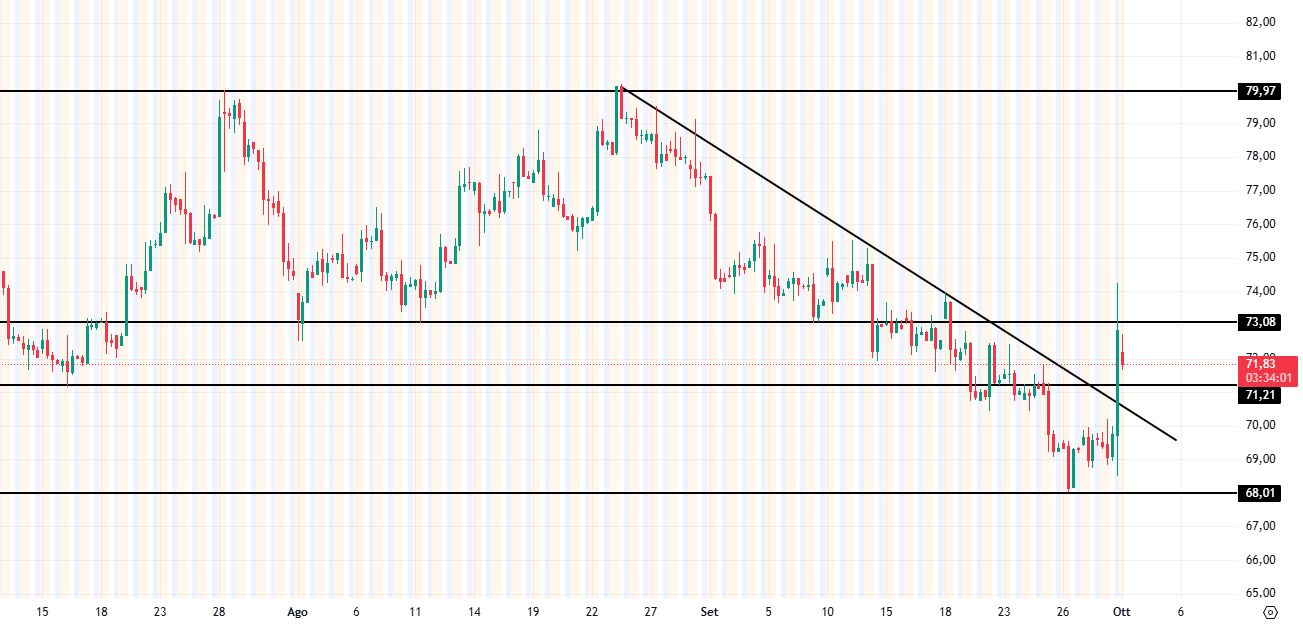 Si potrebbero dunque valutare strategie long in caso di segnali di forza in area 71-68 dollari. In questo caso, posizioni in acquisto avrebbero come primo obiettivo area 76 dollari e un target più ambizioso in zona 80 dollari, successiva resistenza orizzontale.