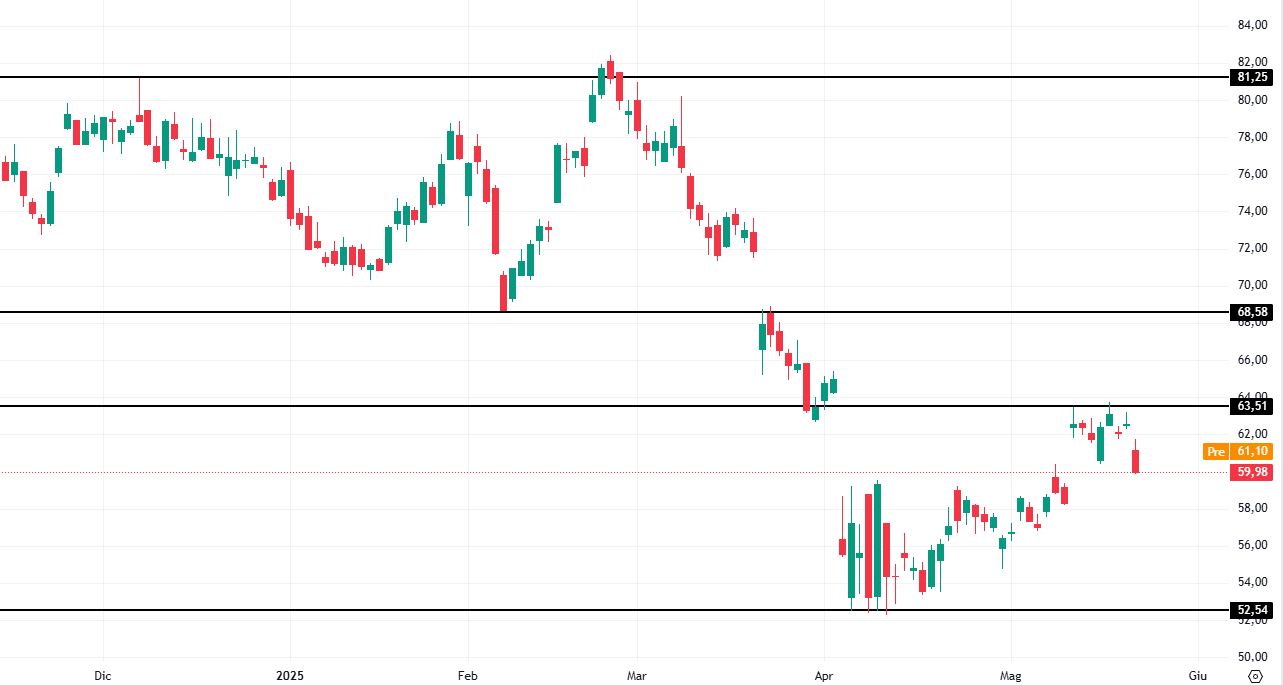 A livello operativo quindi, si potrebbero valutare strategie rialziste in caso di segnali di forza in area 59-57 dollari. Nel breve termine, il primo target potrebbe essere posto in area 63,50 dollari e il successivo in zona 68,60 dollari, successiva resistenza lasciata in eredità dai minimi segnati a febbraio 2025.