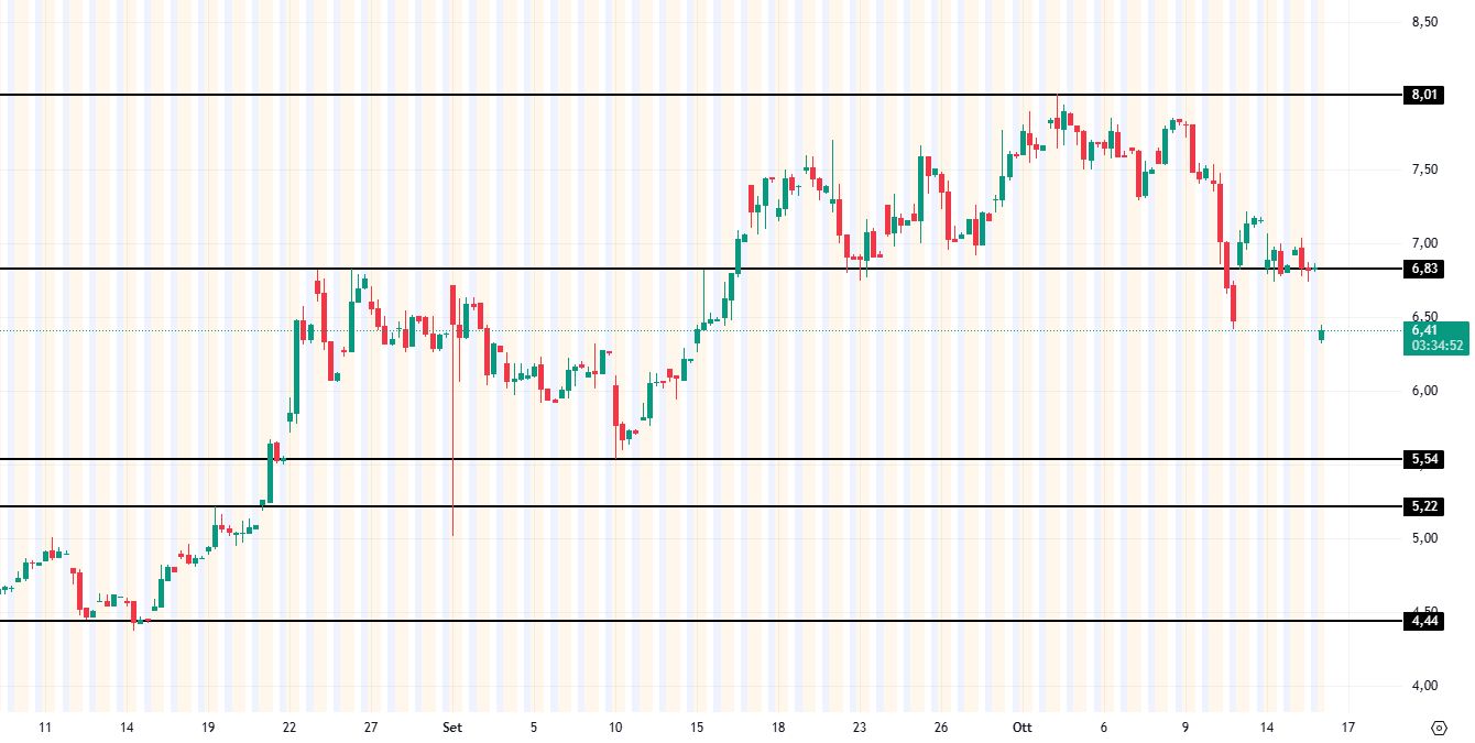Si potrebbero dunque valutare strategie long in caso di segnali di forza in area 6,40 dollari o, nel caso di un proseguimento dello storno, presso il supporto in area 5,55 dollari. In entrambi i casi, il primo obiettivo potrebbe essere posto in area 6,80-7 dollari, mentre un target più ambizioso sui massimi in zona 8 dollari.