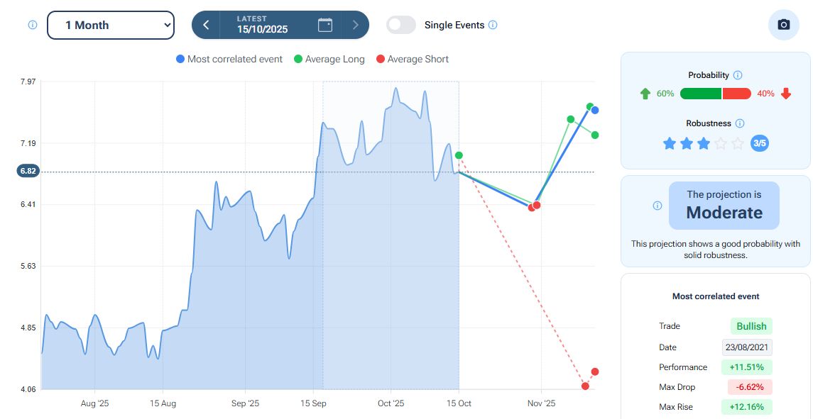Il tool “Projection” della piattaforma Forecaster, con scadenza a un mese, stima – sia nello scenario “best match” sia in quello long, uno storno compreso tra il 6-7% in area 6,40 dollari entro fine mese, seguito da una ripartenza al rialzo fino ad area 7,65 dollari. Guarda il video di lancio della funzionalità, PREVEDERE I MERCATI CON L’INTELLIGENZA ARTIFICIALE: la nuova funzionalità di Forecaster Terminal.