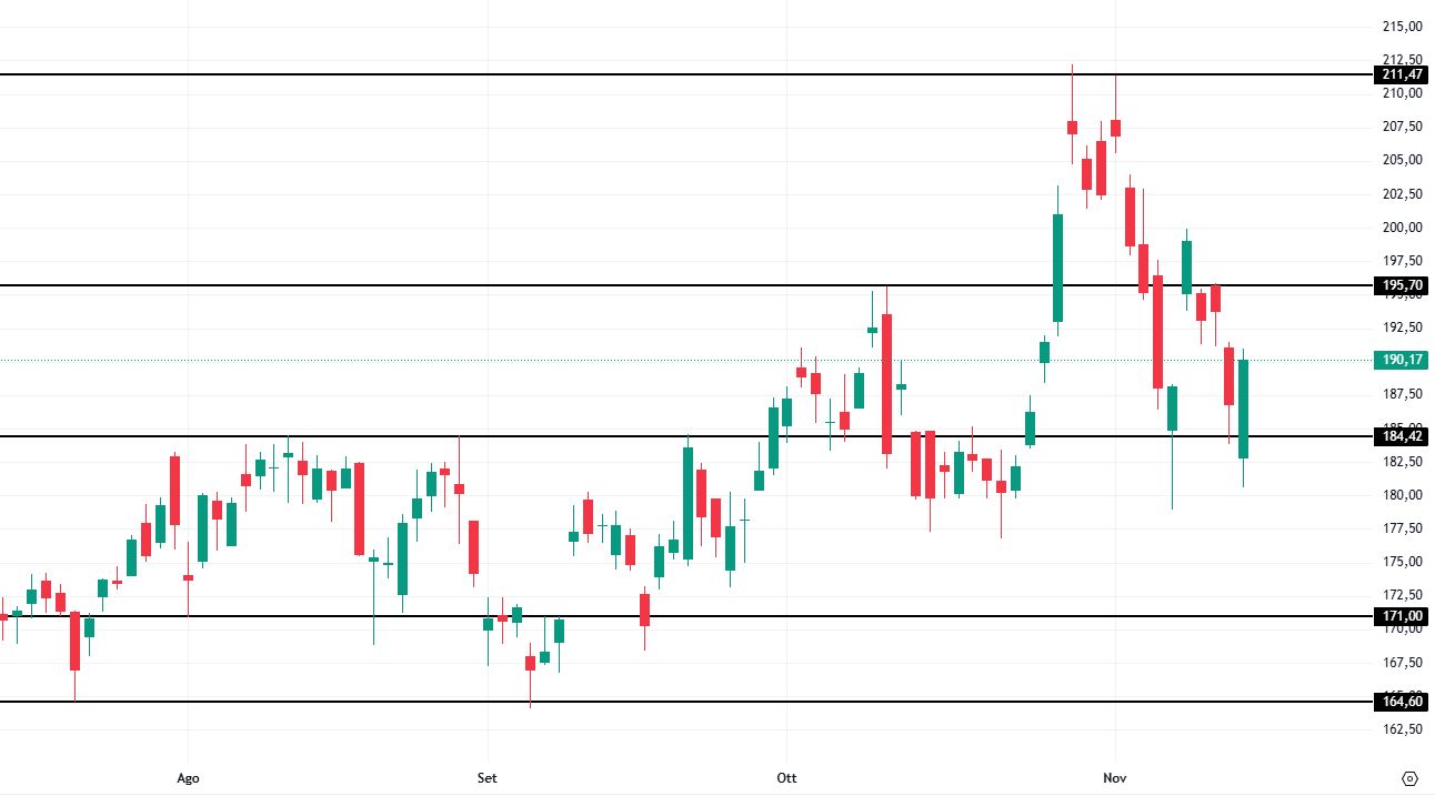 Si potrebbero dunque valutare strategie long in prossimità del vicino supporto, in area 184 dollari. In tal caso, posizioni in acquisto avrebbero come primo obiettivo area 196 dollari e un secondo target sui massimi in area 212 dollari. Nel medio periodo, il quadro grafico rimarrebbe favorevole ai compratori finché verrà difesa l’area di supporto compresa tra i 171 e 164 dollari.