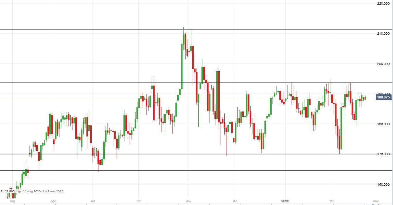 In attesa della trimestrale, le azioni Nvidia rimangono all’interno della struttura laterale-rialzista in atto da agosto dello scorso anno, che vede come area di supporto i 170-164 dollari e come resistenze i livelli statici in zona 193 e 211 dollari. Al momento i prezzi stazionano in area 190 dollari, poco sotto il primo ostacolo per i compratori. L’attuale struttura grafica farebbe privilegiare strategie long.