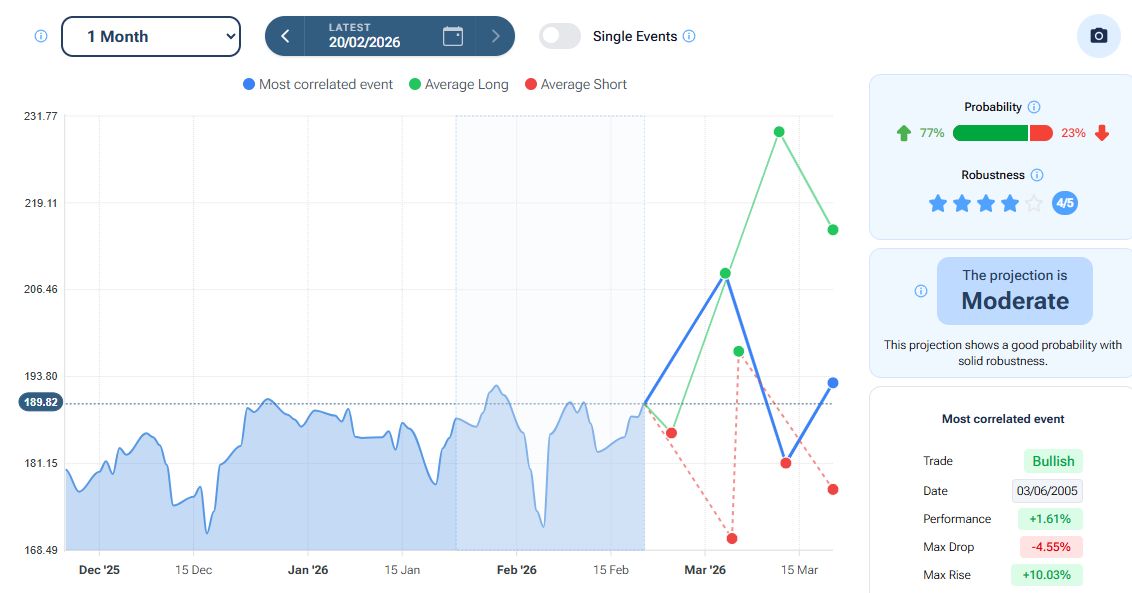 Il tool “Projection” della piattaforma Forecaster, con orizzonte temporale a un mese, evidenzia – nello scenario “best match” (linea blu) - un possibile rialzo vero area 208 dollari, seguito da un eventuale storno verso zona 182 dollari.