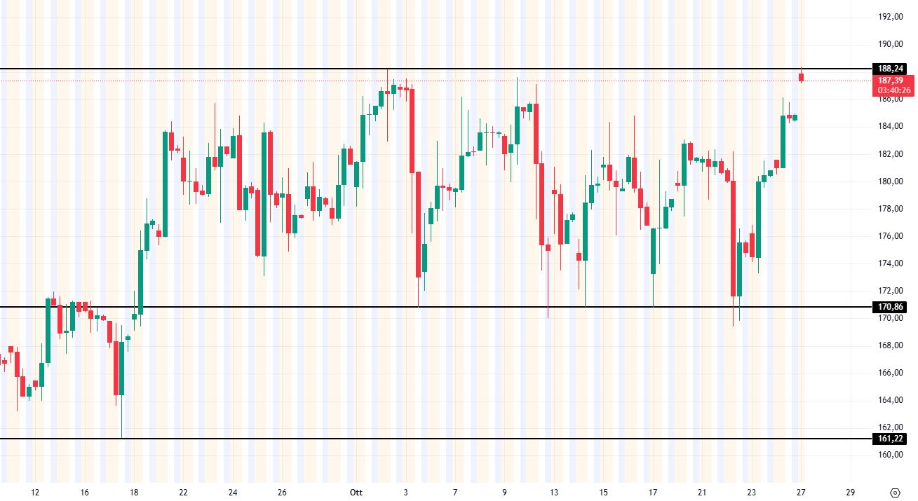 Le azioni Palantir rimangono impostate al rialzo dai minimi registrati in area 66 dollari ad aprile scorso. Nel breve termine, i prezzi rimangono all’interno della struttura laterale in atto dalla terza decade di settembre, che vede come supporto area 171 dollari e come resistenza area 188-190 dollari. L’attuale struttura grafica farebbe privilegiare strategie long in linea con il trend dominante.
