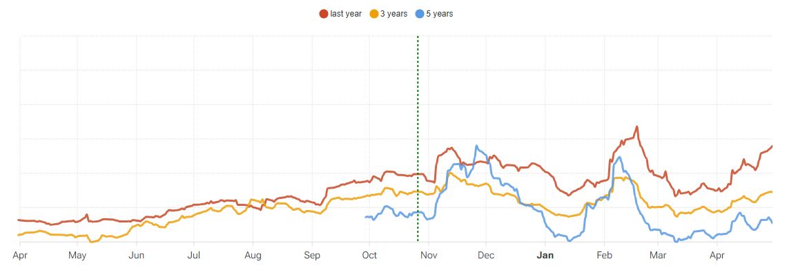 Per quanto riguarda la stagionalità - analizzata con la piattaforma Forecaster - gli archi temporali selezionati mostrano un possibile storno che potrebbe durare fino alla fine della prima settimana di novembre, seguito da una ripartenza al rialzo che potrebbe estendersi fino a fine novembre.