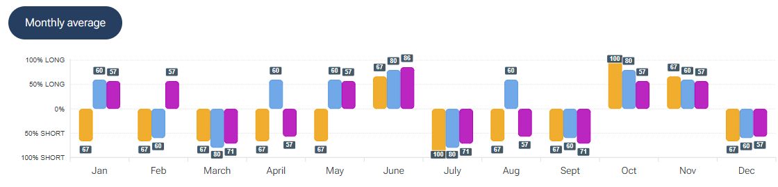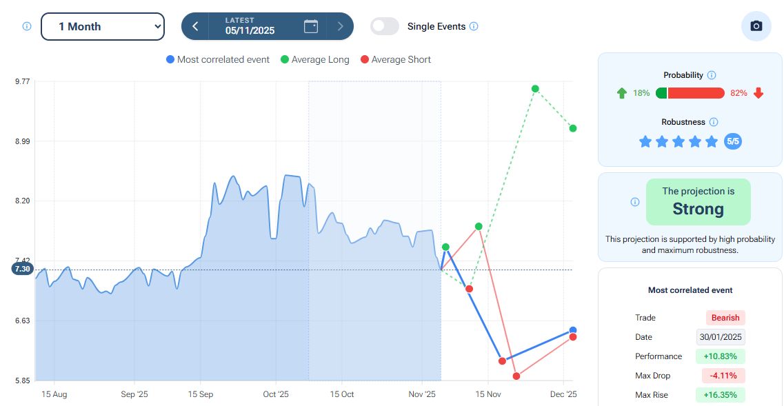 Per quanto riguarda la stagionalità - analizzata con la piattaforma Forecaster - gli archi temporali selezionati mostrano una possibile fase rialzista fino alla fine della prima decade di dicembre, seguita da una possibile fase di lateralità che potrebbe estendersi fino a fine gennaio.
