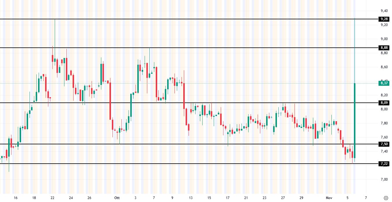 Si potrebbero quindi valutare strategie long in caso di segnali di forza in area 7,5-7,2 dollari. Posizioni in acquisto avrebbero come primo obiettivo area 8,10 dollari e un target più ambizioso in area 8,90-9,30 dollari.