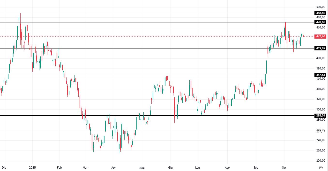 Le azioni Tesla rimangono impostate al rialzo dai minimi registrati ad aprile scorso in area 220 dollari. Guardando al breve termine, i prezzi da settembre si confermano all’interno di una struttura laterale compresa tra il supporto a 419 dollari e la resistenza a 470 dollari. Eventuali segnali di forza potrebbero essere sfruttati per l’implementazione di strategie long in linea con la tendenza dominante.