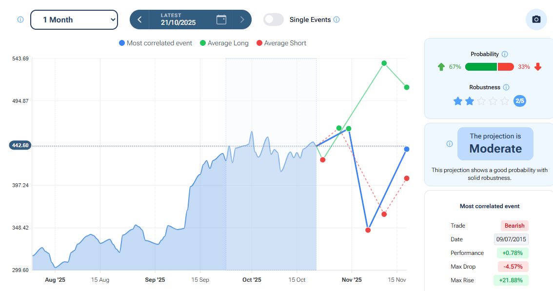 Il tool “Projection” della piattaforma Forecaster, con scadenza a un mese, evidenzia indicazioni contrastanti. Lo scenario “best match” (linea blu) stima dapprima un rialzo nell’ordine del 4,6% circa, seguito da una flessione di circa il 21%, che porterebbe i prezzi in area 345 dollari. Lo scenario long (linea verde), al contrario, stima uno storno di circa il 3,5%, prima di un allungo verso area 538 dollari. Guarda il video di lancio della funzionalità, PREVEDERE I MERCATI CON L’INTELLIGENZA ARTIFICIALE: la nuova funzionalità di Forecaster Terminal.