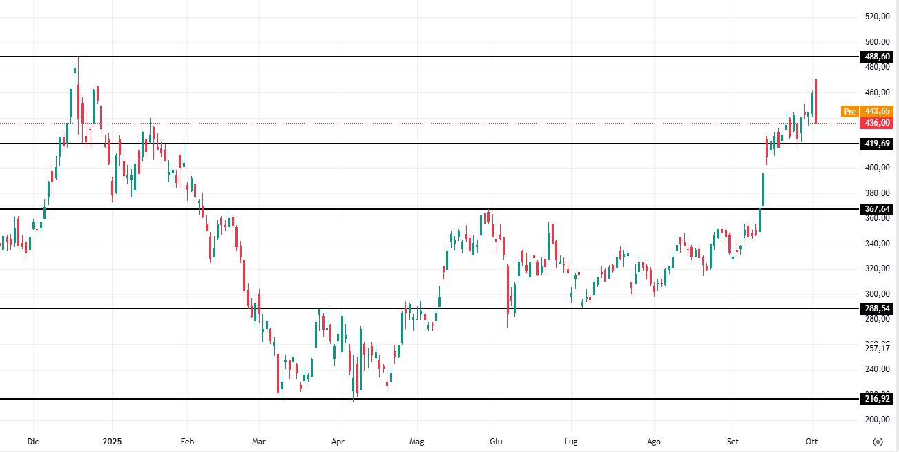 Si potrebbero dunque valutare strategie long in caso di segnali di forza sui sostegni statici a 419 e 367 dollari. In tal caso, il primo obiettivo di profitto dei compratori potrebbe essere posto in area 488 dollari e un secondo target in zona 500-510 dollari.