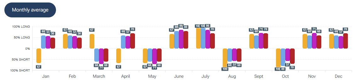 Per quanto riguarda la stagionalità - analizzata con la piattaforma Forecaster - gli archi temporali selezionati mostrano una possibile fase di lateralità-debolezza che potrebbe estendersi fino a metà ottobre, seguita da una possibile fase rialzista che potrebbe durare fino a fine gennaio.