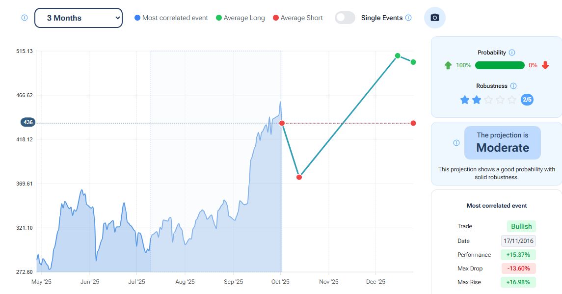 Le indicazioni del tool “Projection” all’interno della piattaforma Forecaster, con scadenza a tre mesi, favoriscono un’operatività long con un iniziale storno stimato entro metà ottobre e un successivo recupero nell’ordine del 17% in area 510 dollari. Guarda il video di lancio della nuova funzionalità: PREVEDERE I MERCATI CON L’INTELLIGENZA ARTIFICIALE, la nuova funzionalità di Forecaster Terminal.