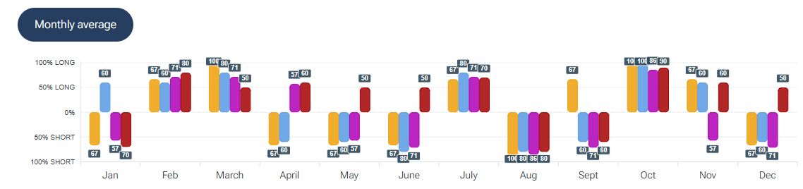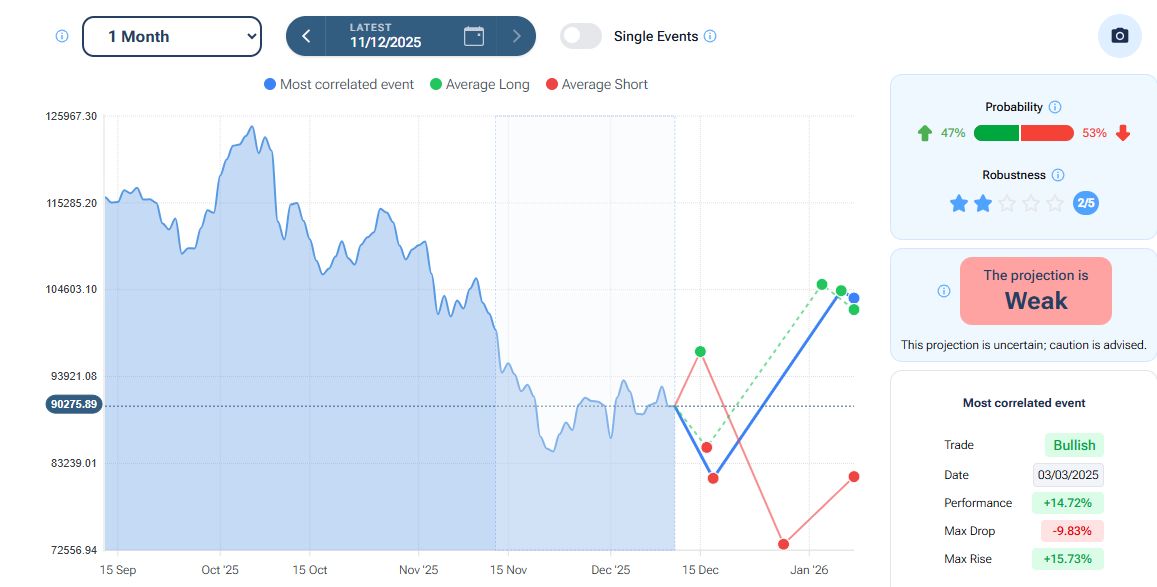 Le quotazioni del Bitcoin rimangono all’interno della fase ribassista in atto da inizio ottobre, che ha portato i prezzi della prima criptovaluta da oltre 124mila dollari agli attuali 90.300 dollari circa. Per quanto riguarda la stagionalità - analizzata con la piattaforma Forecaster - gli archi temporali selezionati mostrano una potenziale fase rialzista fino a metà gennaio, seguita da un possibile breve storno prima di un eventuale movimento positivo.