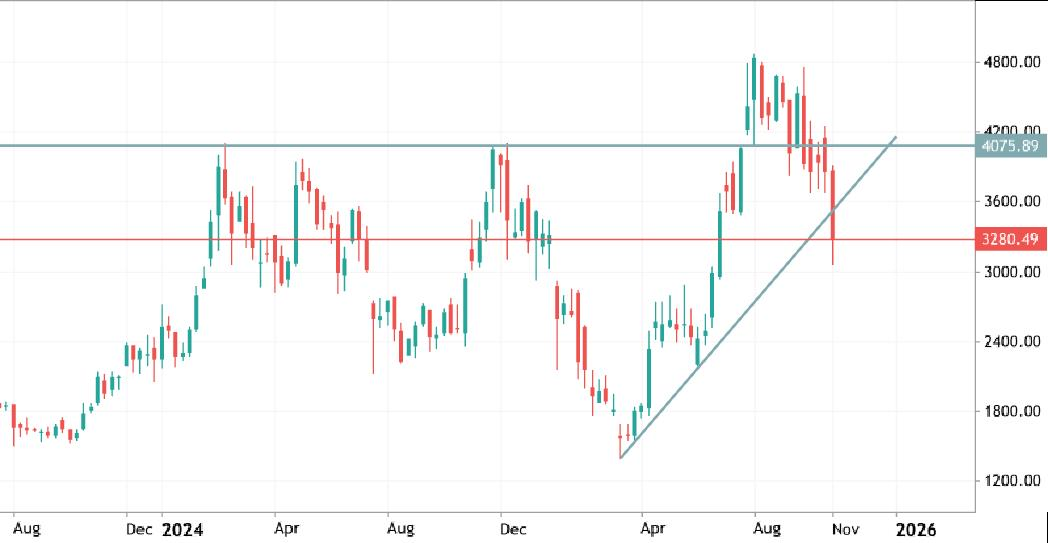 Anche in questo caso previsione centrata in pieno con ETH sceso fino a 3k con un quadro tecnico molto più pericoloso rispetto a Bitcoin perché quello che si sta abbozzando è una rottura ribassista della up trend line che da aprile 2025 (i giorni del Liberation Day di Trump) sta sostenendo un bull market capace di andare ad aggiornare i massimi storici.