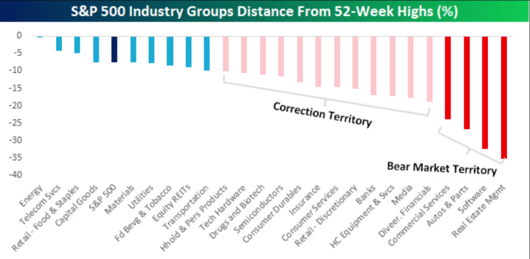 L'analisi condotta da Bespoke Investment Group sui 25 gruppi industriali dell'indice evidenzia disparità enormi tra le diverse asset class.