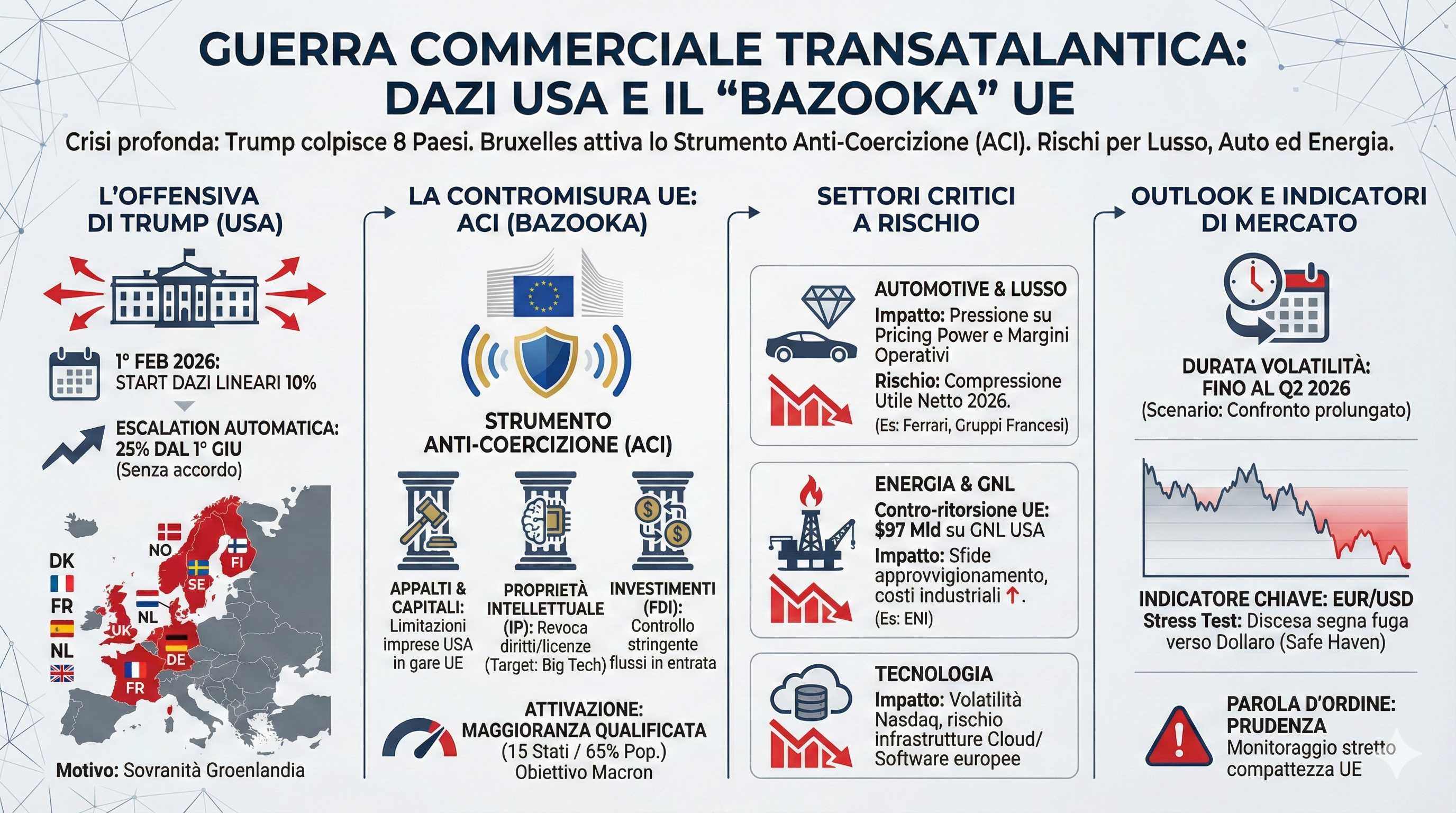 Per gli investitori, la stabilità del cambio EUR/USD rimane il principale indicatore di stress: una discesa nei prossimi giorni segnalerebbe una fuga di capitali verso il dollaro come safe haven (bene rifugio), nonostante le tensioni doganali. La parola d'ordine resta la prudenza, con un monitoraggio stretto sulla compattezza dei 15 Stati membri necessari per attivare le contromisure europee. Le prossime settimane saranno sicuramente molto delicate e l'incertezza potrebbe giocare un ruolo cruciale sui mercati finanziari.