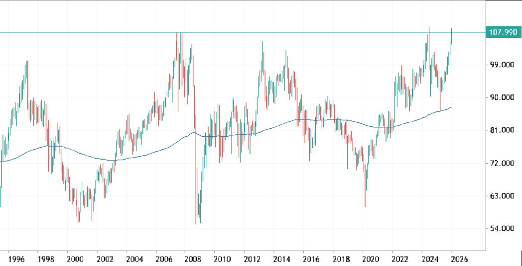 AUD/JPY è l’incrocio di tutte queste tendenze e sfida, come scritto nel titolo, la forza di gravità visto che si presenta al cospetto di massimi già visti nell’estate del 2024 e di nuovo nel 2007.