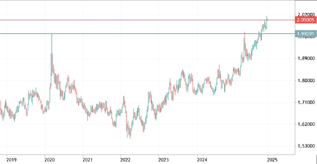 Con il superamento di quota 2 nel rapporto EUR/NZD il cross ha evidenziato una fragilità che adesso fa temere un sell off ancora più violento qualora i mercati finanziari entrassero in modalità correzione. Tecnicamente siamo in una zona quasi inesplorata per EUR/NZD con i massimi storici del 2009 a rappresentare un obiettivo a questo punto non impossibile per i prossimi mesi che risulterebbe particolarmente preoccupanti per le sorti dell’economia neozelandese.