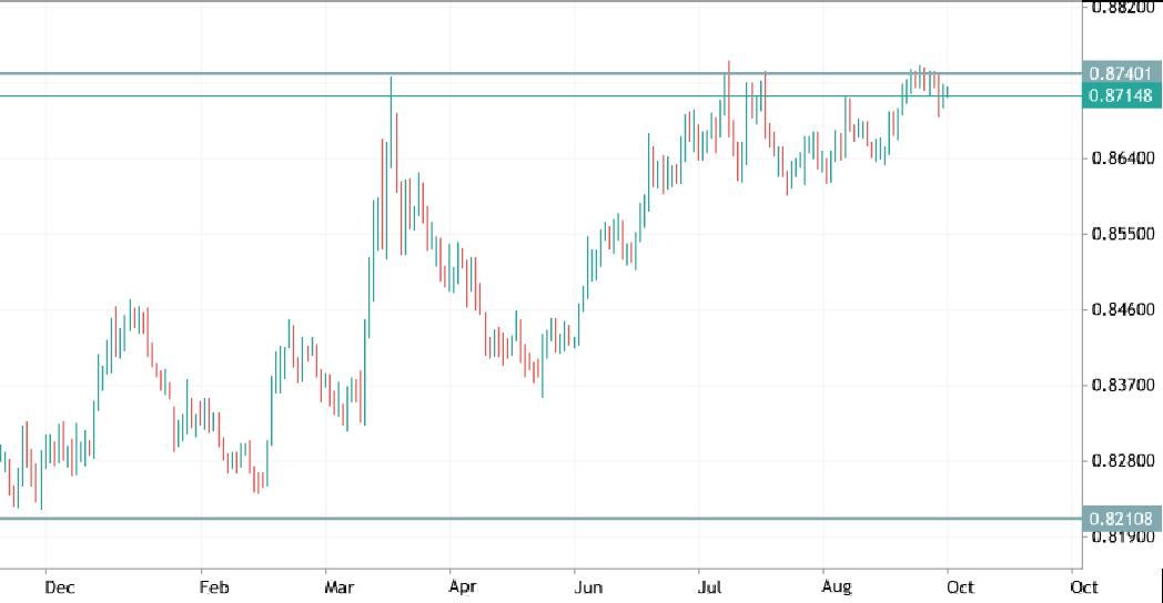 Per EurGbp si può notare graficamente la forza della resistenza da parte di area 0,875 che ha respinto ancora una volta l’assalto dei tori. Uno sfondamento verso l’alto aprirebbe scenari bearish per il pound con primi obiettivi da posizionare tra 0,90 e 0,92.
