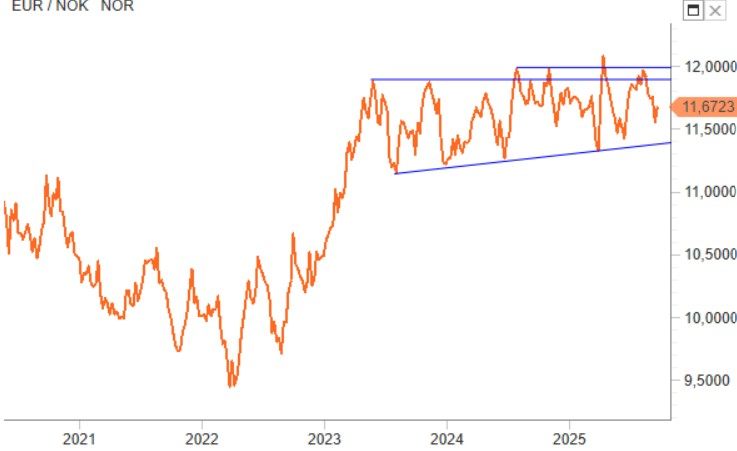 EUR/NOK, che da quasi due anni vive una fase laterale ingabbiato sotto area 12, ha mantenuto le posizioni recenti vicino alla parte bassa del range a conferma del buon momento della corona che guadagna appeal quanto a differenziale di rendimento con l’euro in seguito alle recenti dichiarazioni della Bank of Norway.