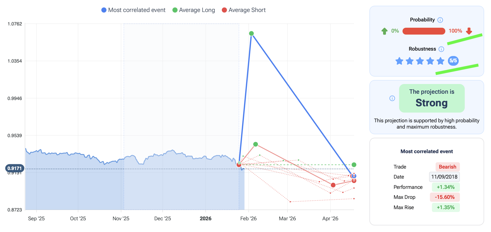 Analizzando il franco svizzero sul Forecaster, la stagionalità supporta la nostra visione short. Sia a 10 che a 15 anni, il mese di febbraio è statisticamente ribassista per EUR/CHF. Anzi, guardando lo storico, i mesi da febbraio a luglio tendono a essere negativi per questo cambio.