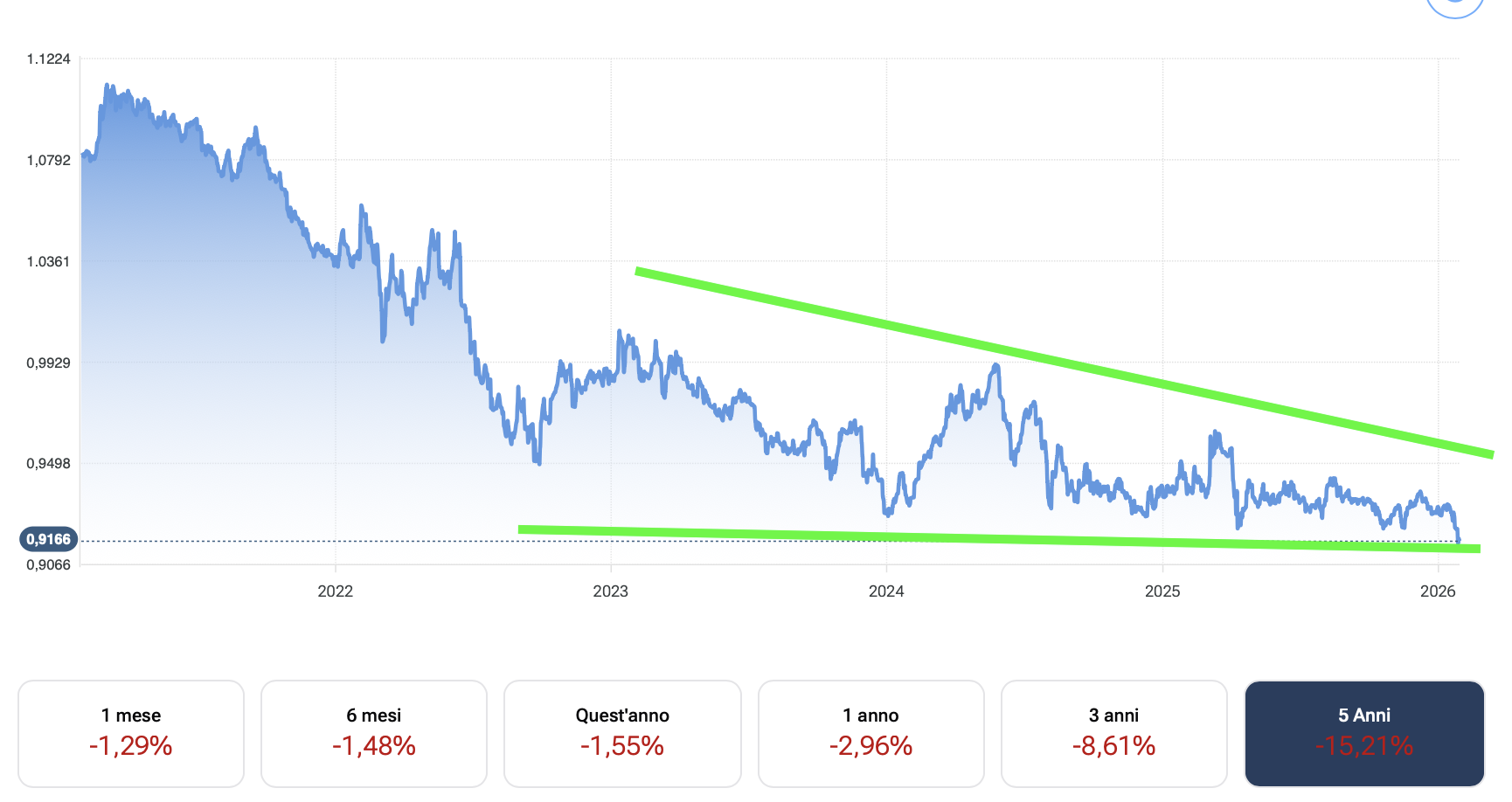 Il cambio ha recentemente toccato nuovi minimi storici, confermando la bontà delle posizioni ribassiste aperte in precedenza. Anche se siamo su livelli estremi, l'analisi tecnica di lungo periodo mostra un triangolo ribassista formatosi negli ultimi tre anni che è pronto a generare un movimento esplosivo verso il basso.