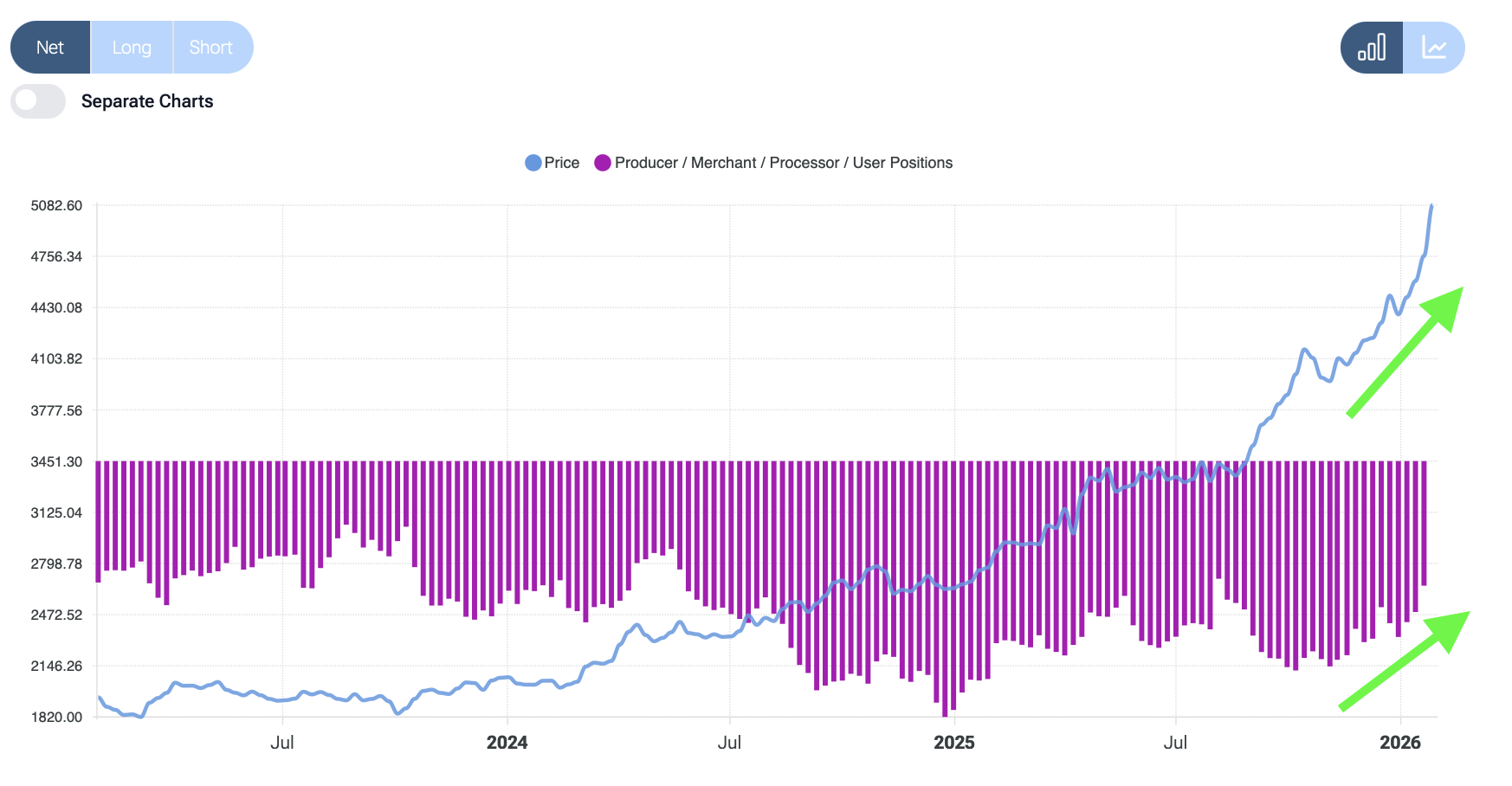 Questo significa che i produttori non si stanno coprendo. Hanno talmente tanta fiducia che il prezzo continuerà a salire che preferiscono correre il rischio piuttosto che pagare per un'assicurazione (lo short) che limiterebbe i loro guadagni. È una conferma magnifica della forza del trend sottostante.