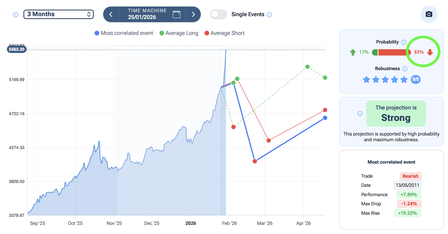 La funzione Projection del Forecaster su questo asset è perentoria: escludendo falsi segnali, la probabilità di ribasso è indicata al 100% con una robustezza della previsione di 5 su 5. Anche guardando indietro nel tempo, la proiezione rimane estremamente negativa.