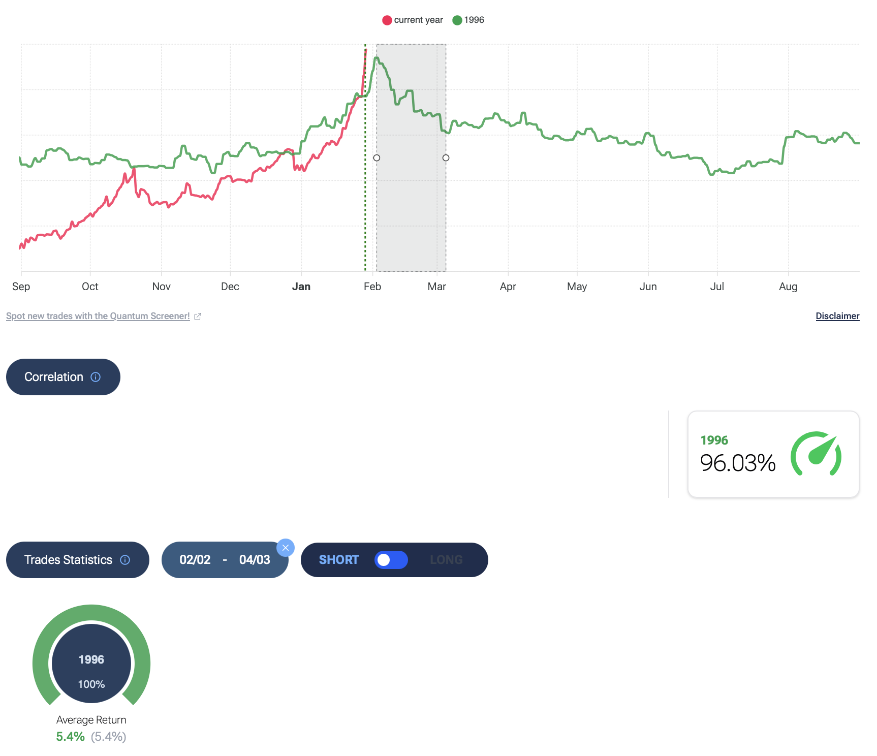 Approfondendo l'analisi con il grafico della "correlazione" presente nel software, notiamo un dettaglio fondamentale: l'andamento attuale dell'oro è correlato al 96% con il 1996. Se guardiamo a cosa è successo in quell'anno, proprio tra fine gennaio e febbraio, l'oro subì un ribasso significativo del 5,8%.