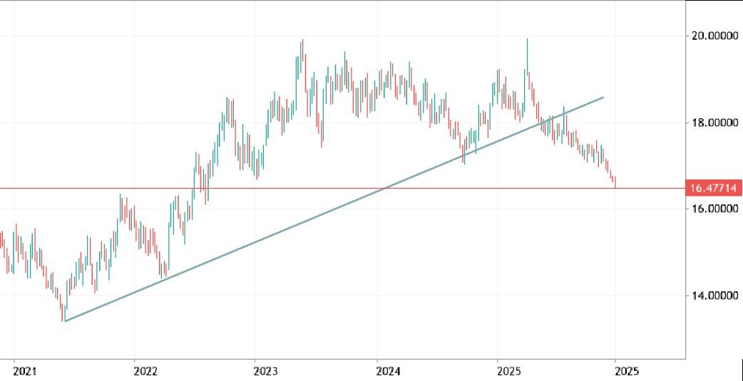 Il cambio USD/ZAR è andato nel corso del 2025 a violare al ribasso la up trend line che da quasi 15 anni guida il bull market. Sarà una rottura genuina? Lo capiremo presto, ma certamente tassi reali positivi e il fatto di essere un Paese grande produttore di materie prime soprattutto preziose, ha fatto la differenza per un rand che nel 2025 ha guadagnato sul dollaro americano il 10%, percentuale alla quale aggiungere le ricche cedole.