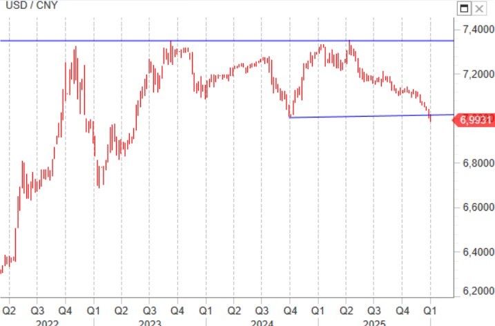 Graficamente su USD/CNY grande attenzione va data al livello pivot indicativo del minimo di settembre 2024. Il cedimento di questo supporto favorirebbe un ribasso che vedrebbe a quel punto 6,70 come primo interessante obiettivo di quello che sarebbe a tutti gli effetti un bear market per il dollaro americano.