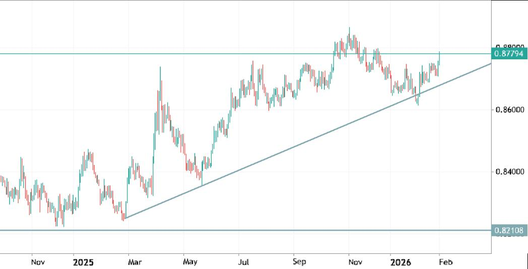 L’occhio fine dell’analista tecnico potrebbe intravedere la formazione teorica di una figura di testa e spalla, ma siccome "trend is your friend" non mi sentirei di escludere a breve un tentativo della sterlina di andare ad aggredire i massimi del 2025 puntando direttamente quella zona di 0,90 che non si vede dal 2023.