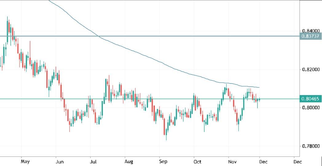 Nel cambio USD/CHF abbiamo assistito ad un nuovo tentativo di violazione delle resistenze di 0,81, ma senza successo per il momento. Si nota graficamente l’importanza di questo livello che per ben due volte a novembre ha respinto l’assalto del dollaro.