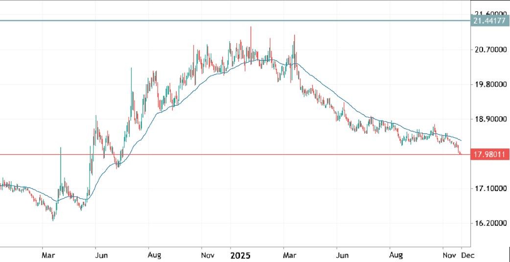 Altra valuta che potrebbe aver raggiunto il massimo nel corso del 2025 è il peso messicano. Dopo una corsa ininterrotta da inizio anno, il cambio USD/MXN in area 18 potrebbe trovare una base di supporto molto solida.