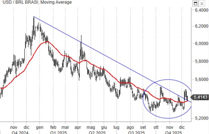 Non sono infatti le prospettive, per ora remote, di un taglio nei tassi nel 2026 ad aver alimentato le vendite consistenti di BRL, quanto invece la notizia della candidatura del figlio dell’ex premier Bolsonaro alle elezioni del 4 ottobre 2026. Evento che potrebbe creare tensioni anche a livello internazionale considerando la vicinanza di Trump all’ex Presidente, ma anche e soprattutto il ricatto dell’arma dei dazi tuttora portato avanti dall’amministrazione americana verso il Brasile con tariffe del 50% seppur sfumate sui prodotti alimentari nelle ultime settimane.