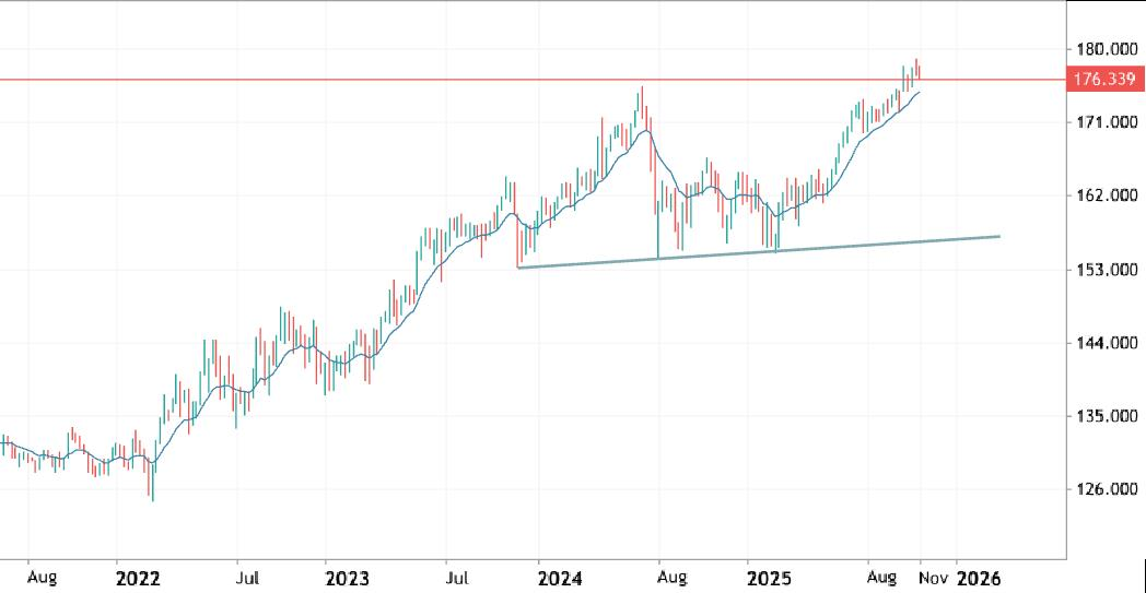 Per EUR/JPY a 180 troviamo i minimi del lontano 1988 a fare da ultima resistenza. Con ottobre fanno otto i mesi consecutivi di rialzo segno di un’arrendevolezza della valuta giapponese piuttosto disarmante. Anche in questo caso andando oltre zona 180 si aprirebbero falle tecniche molto pericolose che metterebbe il 200 tra gli obiettivi più probabili.