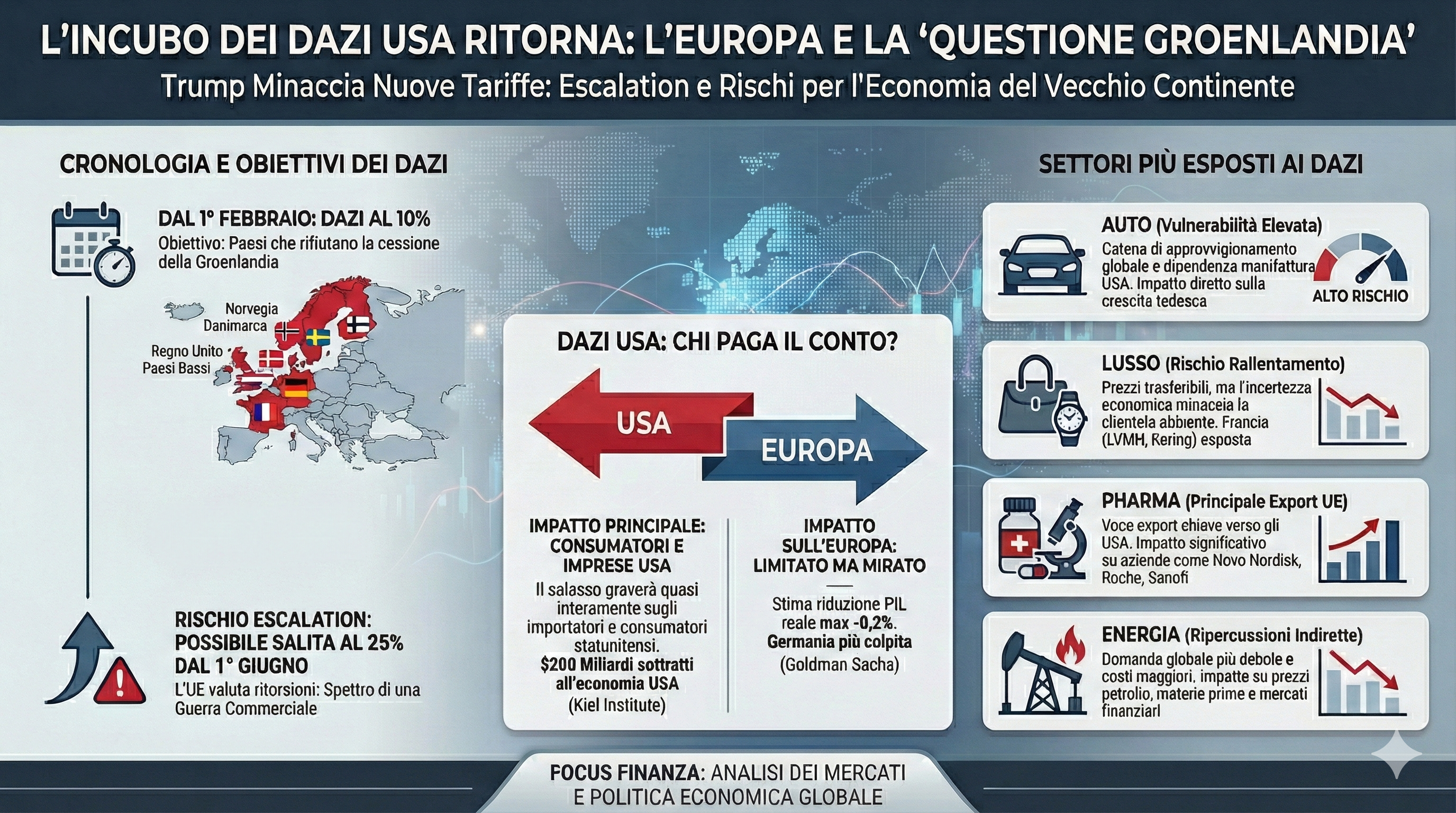 In Europa è tornato l’incubo dei dazi USA. Questa volta il motivo che ha spinto il presidente degli Stati Uniti, Donald Trump, a minacciare nuove tariffe si chiama Groenlandia. Il Vecchio Continente non è disposto a consegnare nelle mani americane il territorio autonomo della Danimarca e Trump, in attesa di verificare se la questione avrà sviluppi di natura militare, ha pronta una nuova ondata di dazi.